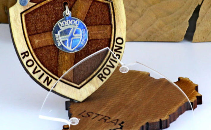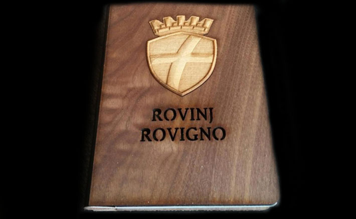 Grb je izrađen na način da se spaja s Istrom na točki gdje se Rovinj nalazi. Spojevi su izvedeni jakim magnetima tako da je rasloživ i zgodan za transport. U drvenom grbu je napravljeno mjesto za srebrni privjesak za ogrlicu s istim motivom tako da